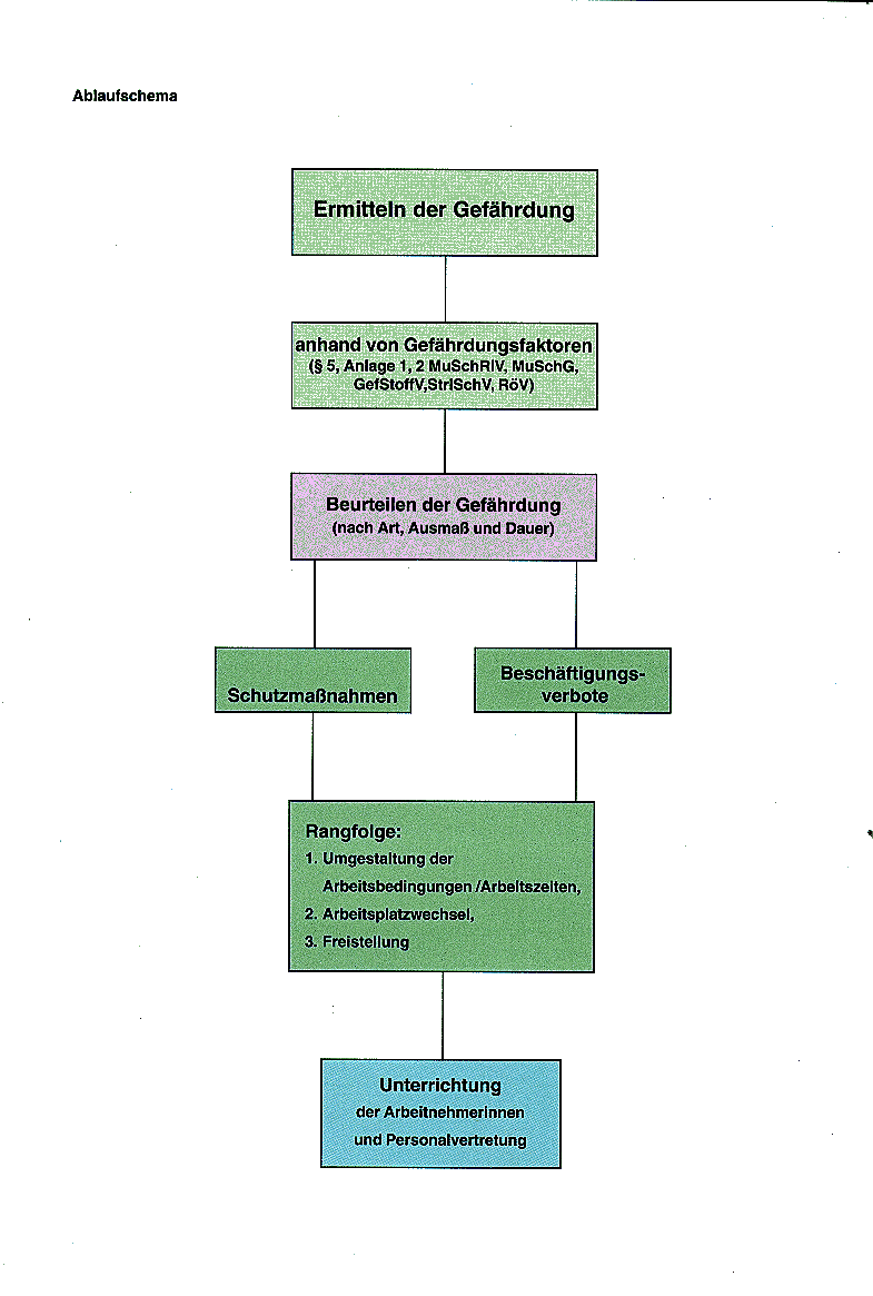 Mutterschutzrichtlinienverordnung Seit dem 15. April 1997 wird das Mutterschutzgesetz ergänzt durch die Mutterschutzrichtlinienverordnung. Damit sind einige Neuerungen zu beachten, nämlich die um alle Gefahren für die Sicherheit und Gesundheit sowie alle Auswirkungen auf Schwangerschaft oder Stillzeit der betroffenen Arbeitnehmerinnen abzuschätzen*. Die Beurteilung ist vom Arbeitgeber vorzunehmen. Er kann zuverlässige und fachkundige Personen schriftlich damit beauftragen, diese Aufgabe in eigener Verantwortung durchzuführen. Die Beurteilung ist rechtzeitig, d.h. umgehend nach Mitteilung der Arbeitnehmerin über eine bestehende Schwangerschaft oder eine geplante Stillzeit, und ggf. vor Weiterbeschäftigung der Arbeitnehmerin durchzuführen. Denn Aufgabe des Mutterschutzes ist eine möglichst frühzeitige Prävention eines Schadens für Mutter und Kind. Ergibt die Beurteilung, daß die Sicherheit oder Gesundheit der betroffenen Arbeitnehmerin gefährdet ist und daß Auswirkungen auf Schwangerschaft oder Stillzeit möglich sind, so resultieren daraus Schutzmaßnahmen bzw. Beschäftigungsverbote