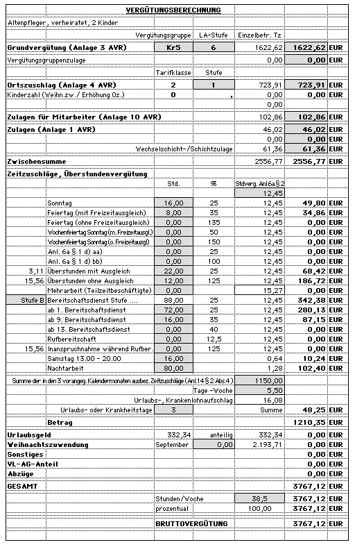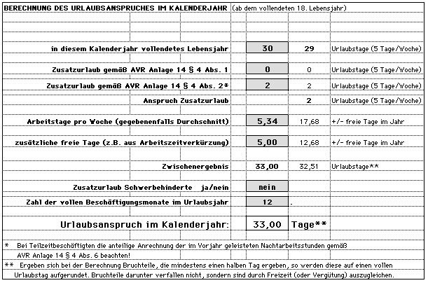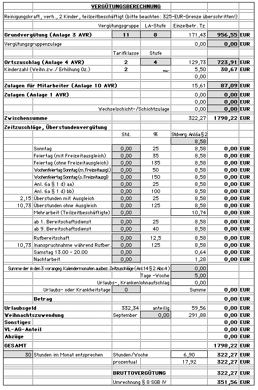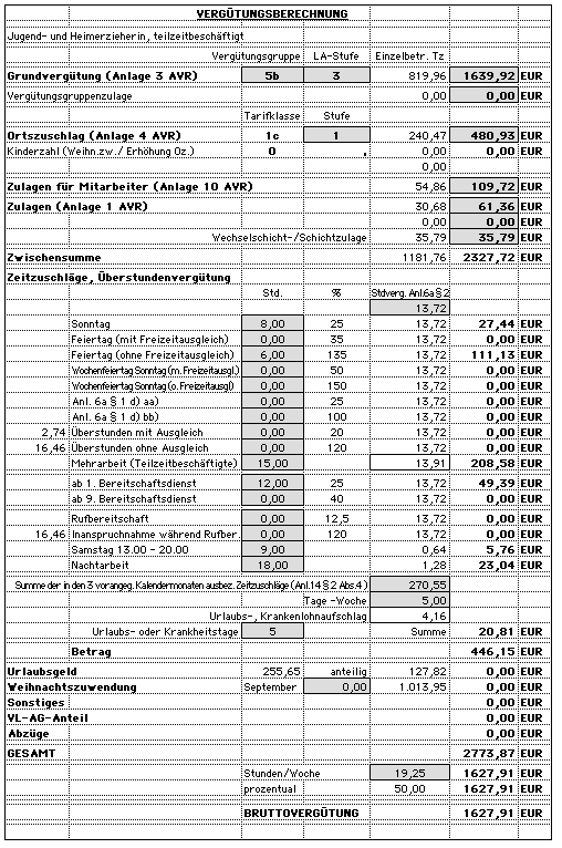 Beispielberechnungen Stand: Januar 2002 Beispielberechnung 1 Jugend- und Heimerzieherin, teilzeitbeschäftigt Beispielberechnung 2 Altenpfleger Beispielberechnung 3 Reinigungskraft, 30 Std/Monat: geringfügig beschäftigt oder nicht? Beispielberechnung 4 Berechnung des Urlaubsanspruches Beispielberechnung 1: Beispielberechnung 2: Beispielberechnung 3: Beispielberechnung 4: