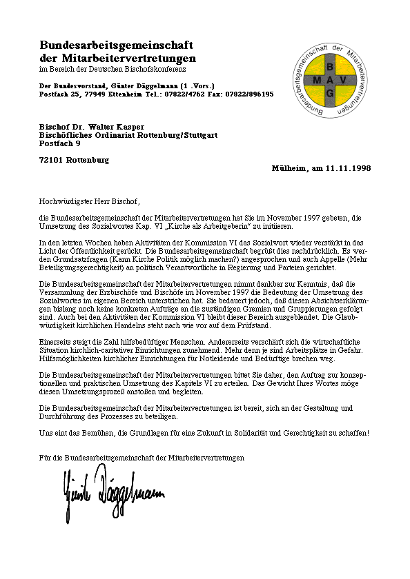 Mitgliederversammlung der Bundesarbeitsgemeinschaft der Mitarbeitervertretungen (BAG-MAV) im Bereich der Deutschen Bischofskonferenz vom 9.-11.11.98 in Mülheim (Ruhr)